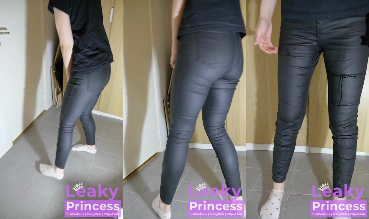 LeakyPrincess is running toward the bathroom, she really really needs to pee, but someone is in there. Leaky is panicking and banging on the door. Jumping and dancing trying to hold it, Leaky knows she won't make it and eventually decides to just let go right there in the hallway. She wets her tight leather jeans, making a big pool on the floor. Relieved and not needing the bathroom anymore she walks away.