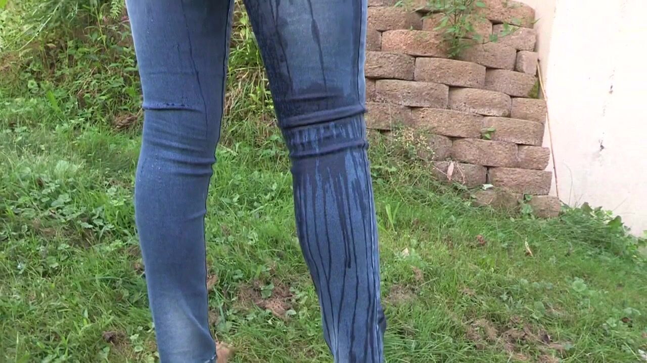 It has only been ten minutes since Jasmine peed into the graduated cylinder. She has barely finished getting dressed in fresh clothes before she announces that she has to pee again. Unenthusiastic to let the opportunity pass, she is instructed to put on another pair of jeans and step outside. She is squirming and expecting to have to hold it for a while, but instead she is told to just wet herself. She looks so relieved as she empties her bladder yet again. The jeans she is wearing are designer and lined so pee does not come through very readily, but she managed to get them pretty wet just the same. Pee also streamed off her bare foot as she was going, and this was captured by the camera.
