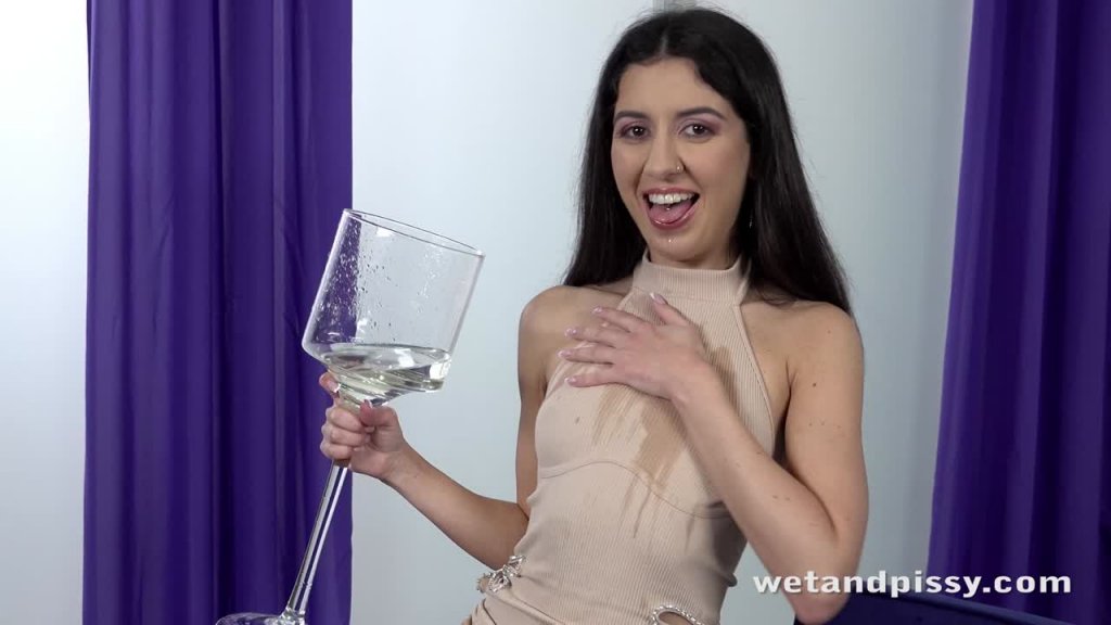 Raven haired hottie Katty West walks over to the couch in a skintight minidress. This sexy babe loves to tease and as she perches on the edge of the couch, she pulls her leopard print panties up between her pussy lips. Katty suddenly holds onto her crotch and stands up, looking for a playful way to relieve her piss desperation. She stands over a giant glass goblet and pulls her panties to one side before she starts pussy pissing right into it! We zoom in on her pee stream as she aims it into the goblet then Katty splashes it ih her fingers before she pours her golden piss in mouth. This naughty babe spits her juices back out over herself and then pours the rest of the contents down her minidress, soaking herself through the skintight fabric! Katty strips and bends over on the couch to finger her juicy pussy. This horny babe starts to piss again, this time over the couch before she licks her fingers and gets down onto the floor to toy a glass dildo! With plenty more piss streams and sex
