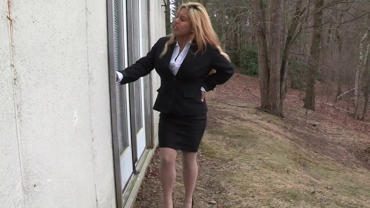 Desire is a trainee in the real estate business and is along for the ride with her older, more experienced colleague to learn the ropes. One of the things she certainly needs to learn is not to have a cup of coffee before leaving the office to go on a showing. At the house, they discover that the owner is not there and that no lock box has been fitted. They have called the office to get someone to come out with a key, but in the meantime they have to wait outside. Desiree badly needs to pee and talks about how she wishes the door was open. She tries to hide her desperation from her colleague, but as the minutes pass and her situation grows worse, she is less successful at this. Eventually, she has to admit the reason for her restlessness. Barely a minute later, she wets herself, leaving huge pee stains on her tights. The colleague is concerned that the client will spot this right away and orders her back to the car to remove the tights, before anyone sees what she has done.
