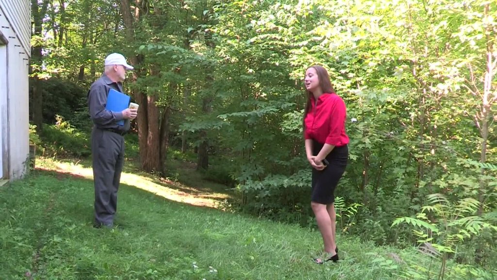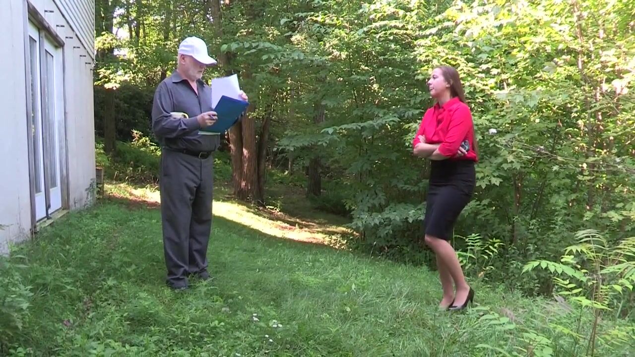 Becky is new to the world of real estate and property appraisals, and she has been teamed up with one of the firm's senior realtors to help her learn the ropes outside of the classroom. Today, he has taken her to a run down property which needs a lot of repair before it can go on the market. They have no access to the building, which is unfortunate for Becky because she badly needs to pee. Given the seniority of her colleague and the sheer embarrassment of admitting that she needs to relieve herself, Becky does her best to hide her desperation. This becomes acutely difficult when her colleague tests the outside water tap to see if water is still running, and a minute later rinses out his coffee cup. Unable to control herself any longer, Becky moves away from her colleague and stands facing him as she discretely wets herself, hoping he will not notice. He is so preoccupied that he doesn't even glance her way; nevertheless, the backs of Becky's stockings are very7 wet and pee has collect