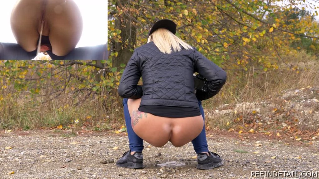 Lenka got a job from an airline - to photograph a take-off of a new aircraft. The so-called "aircraft spotters" always try to get as close to the airport to be able to take photos from interesting angles and close distances. Lenka is a bit late and didn't even have time to take a quick pee in her office so she's clearly getting desperate now. Luckily there are lawns and bushes around and there is still time for a quick squat.