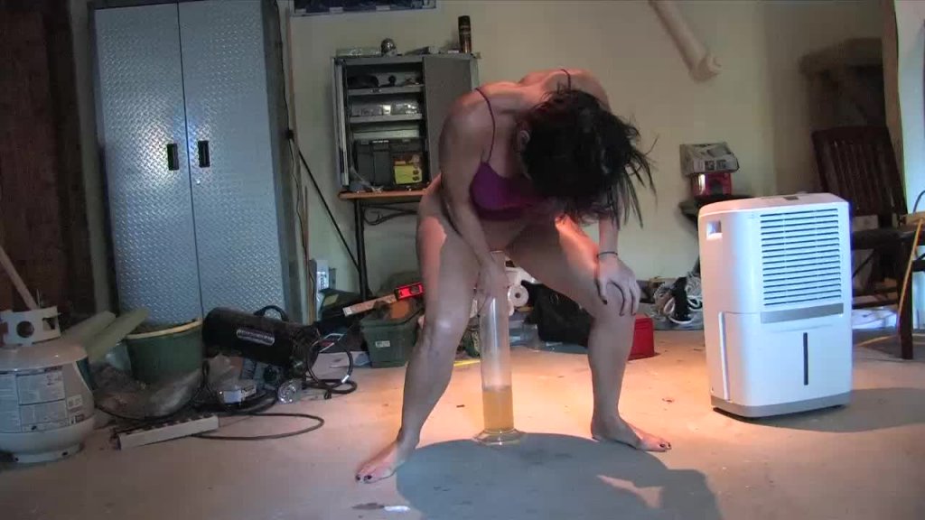 Taylor managed to get herself hopelessly lost on her way to the shoot, and ended up taking a huge detour that added several hours to her journey. She needed to pee but decided she would make herself hold it until she arrived. As a result, she turned up in a frantic state, her shorts unbuttoned and saying she had been forced to drive without a seatbelt she needed to pee so badly. She suggests that we measure her output, so she hurries down to the basement and releases into a graduated cylinder.