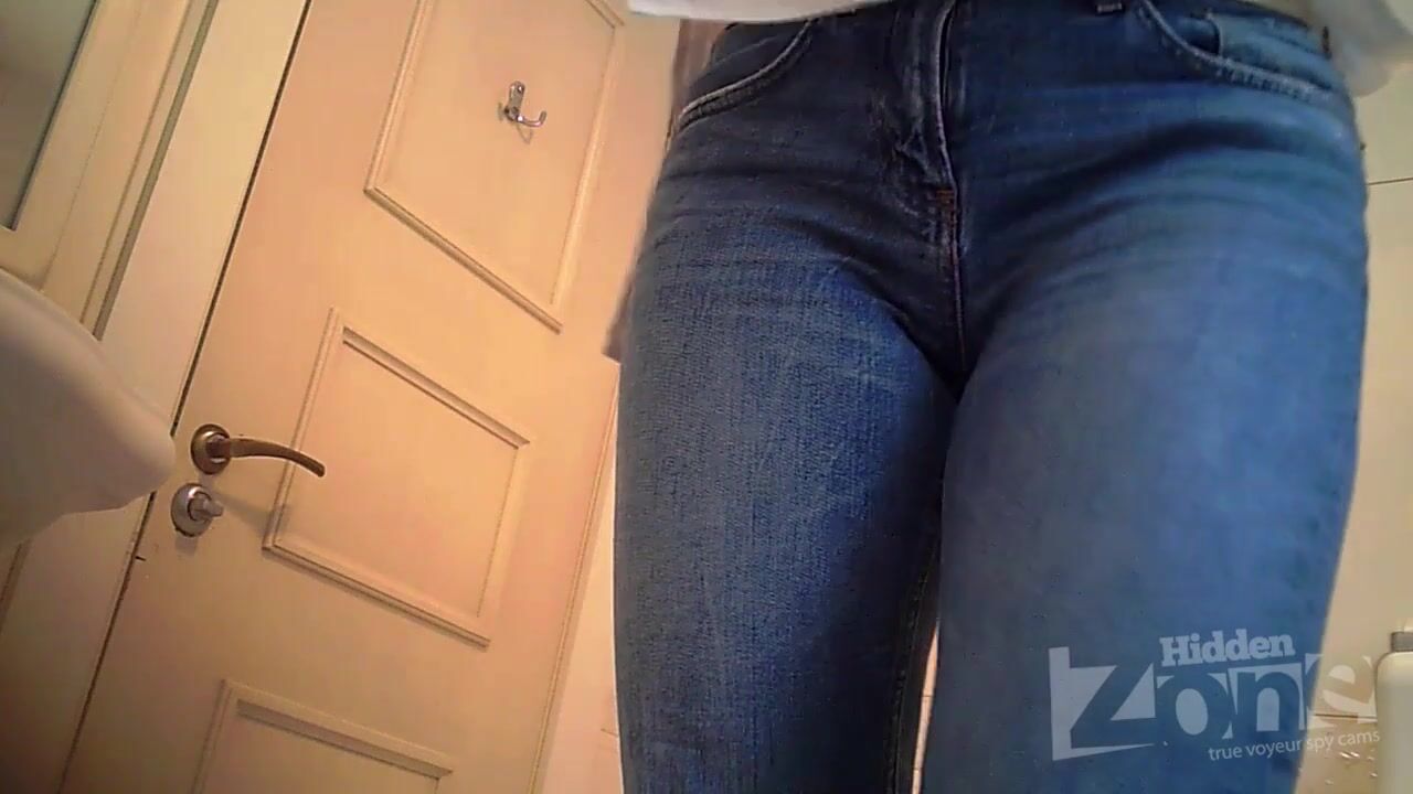 Tanned woman in blue panties peeing while standing. Shaved pussy and anus hit the lens of our hidden camera close-up. An excellent model for shooting a spy camera in the toilet.