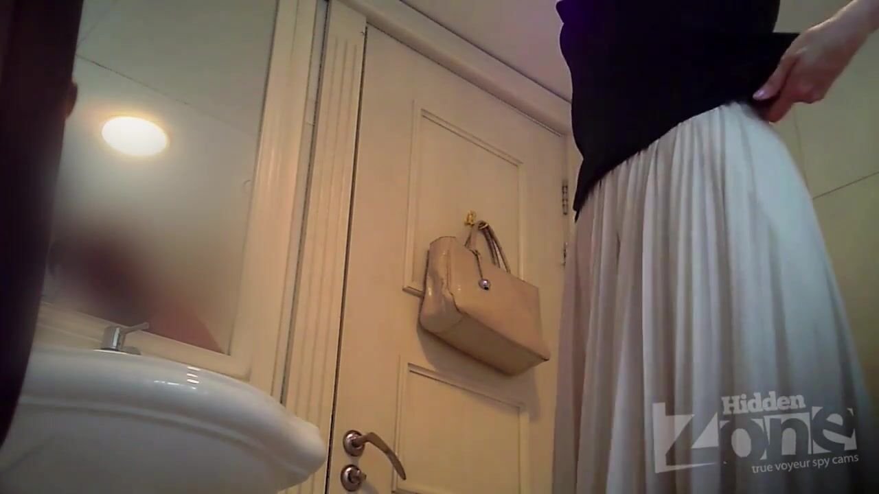 Slender brunette in white panties pee standing. View from one camera. Shaved crotch and anus close-up. Another great spy cam in the toilet.