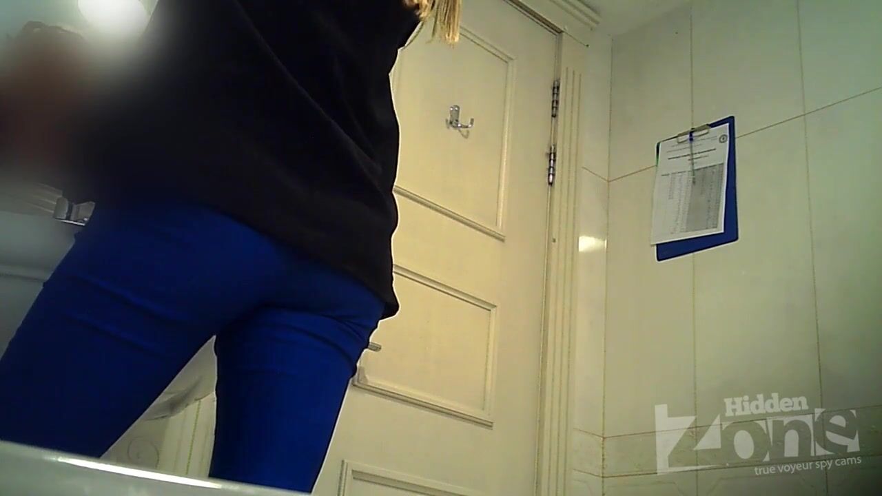 Blonde in black panties pee sitting. View from one camera. Our cameraman filmed her round ass and shaved crotch on a spy camera.