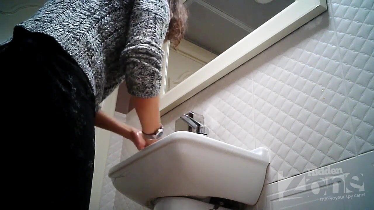 Chubby woman in gray panties pee standing. View from one camera. Hairy crotch and huge ass close-up. In the cafe?s toilet you can meet different models for filming with a hidden camera.
