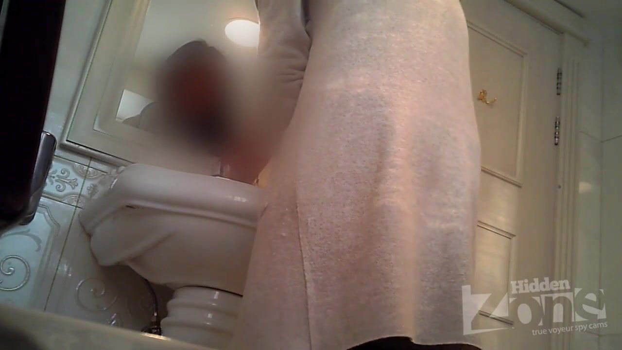 A tanned brunette in black panties was peeing while standing. View from one camera. Shaved crotch and tanned ass fell into the lens of our hidden camera.