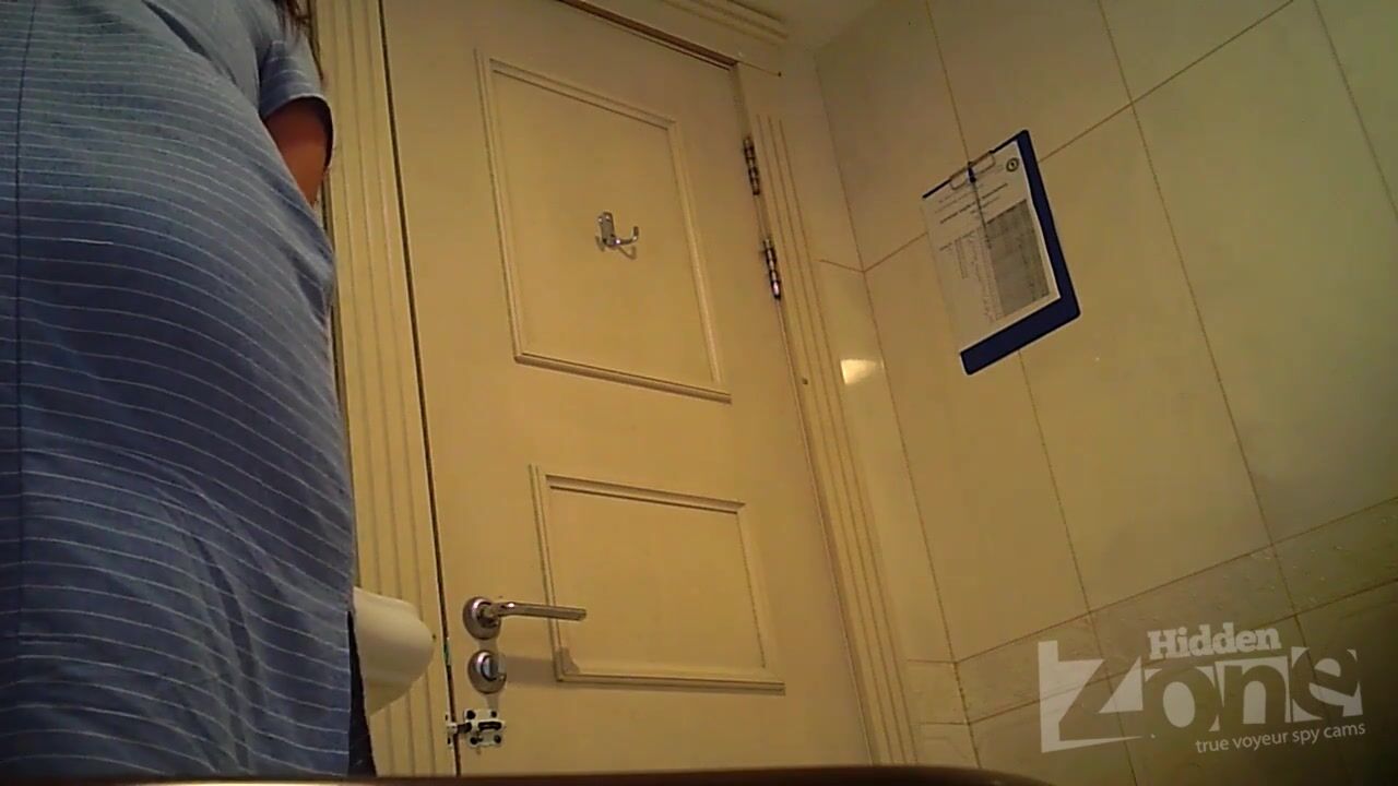 A tanned brunette in black panties was peeing while standing. View from one camera. Our spy camera caught a close-up of her shaved pussy. A great model for filming a hidden camera in the toilet.
