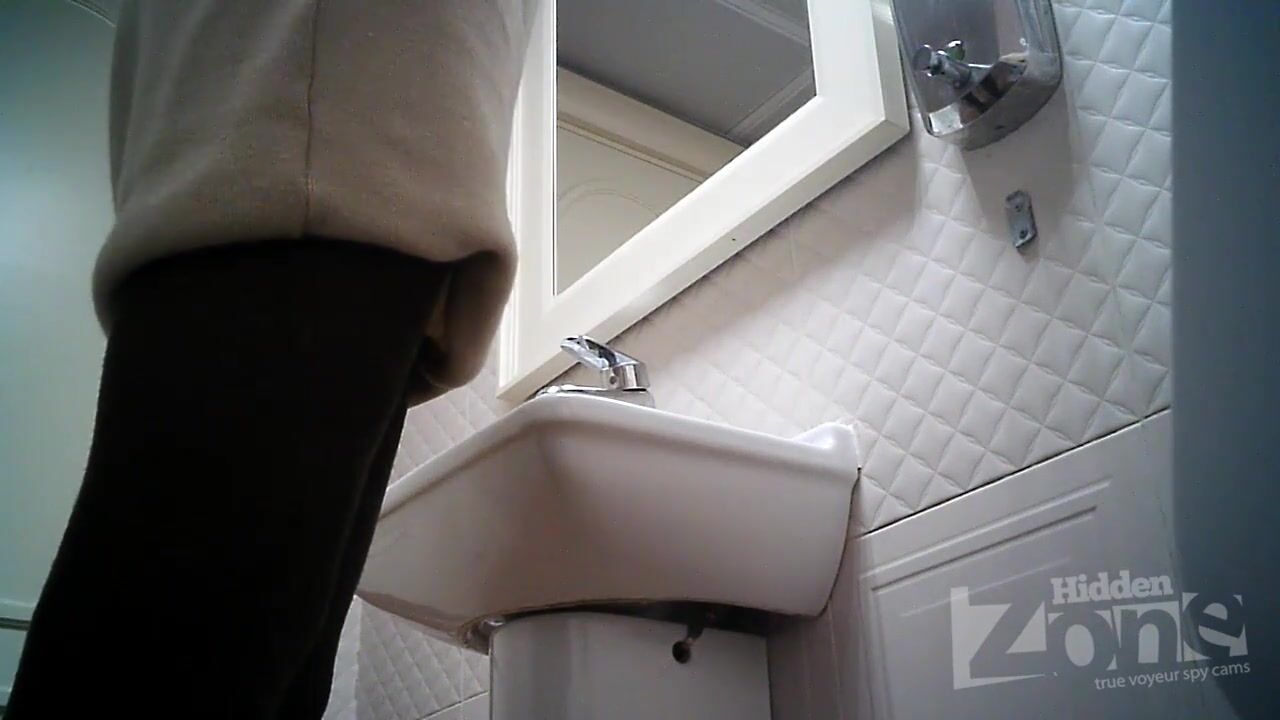 Slender brunette in black panties pee standing. Shaved pussy close up. In the toilet of the cafe you can meet different models for filming with a hidden camera.