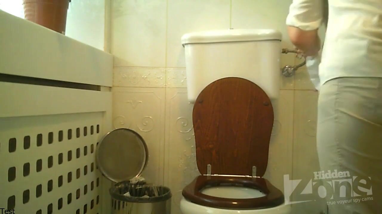 Woman in blue panties pee sitting. View from two cameras. Good shots from the front camera. Shaved pussy close up.