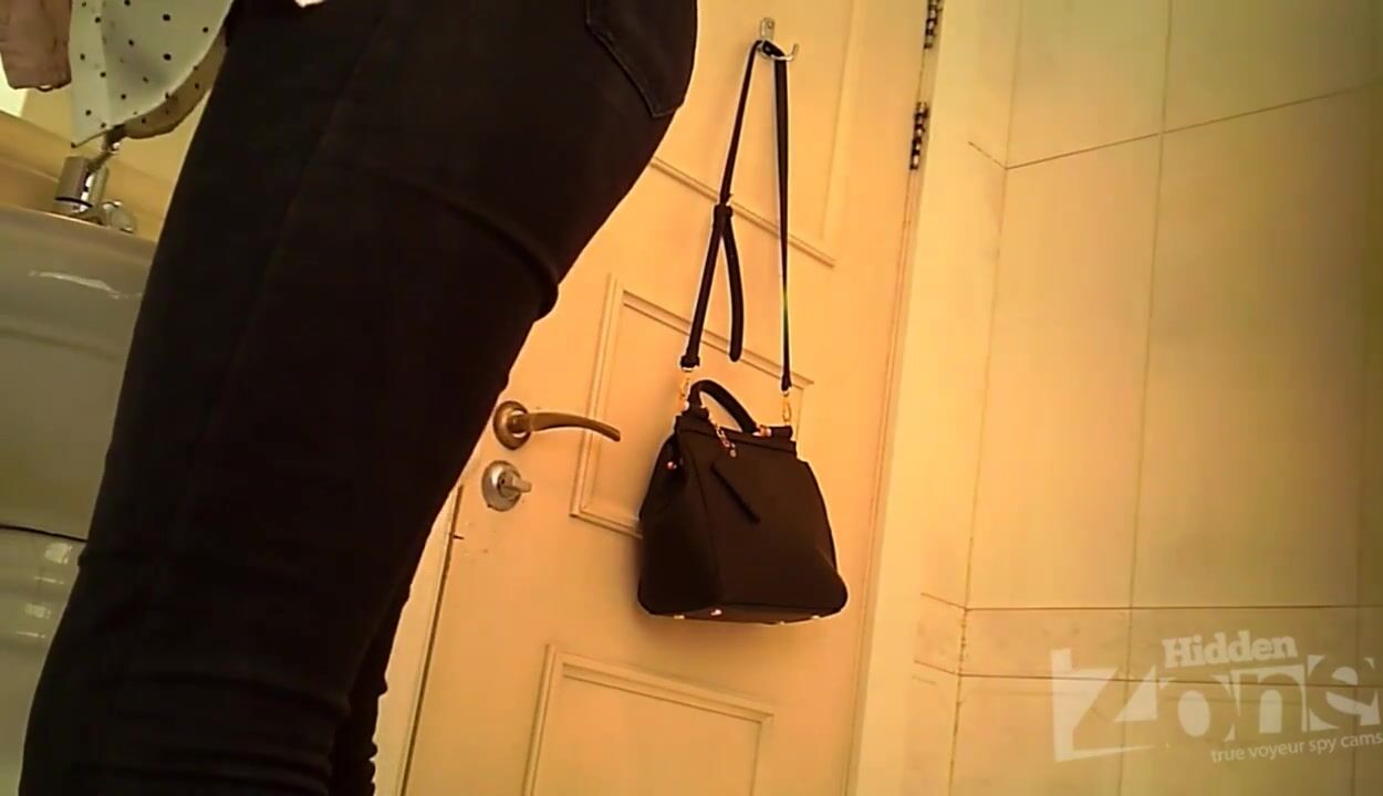 Girl in green shorts pee standing up. View from one camera. Our hidden camera took a close-up picture of her shaved pussy and beautiful ass.