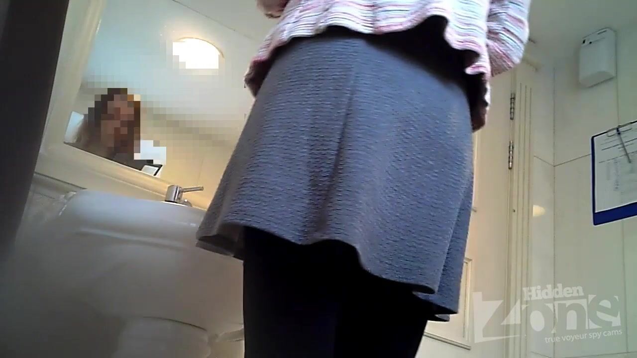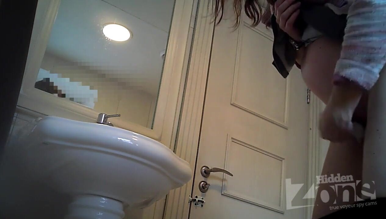Pregnant girl in gray panties pee standing up. View from the rear camera. Round ass and shaved crotch got into the lens of our hidden camera.