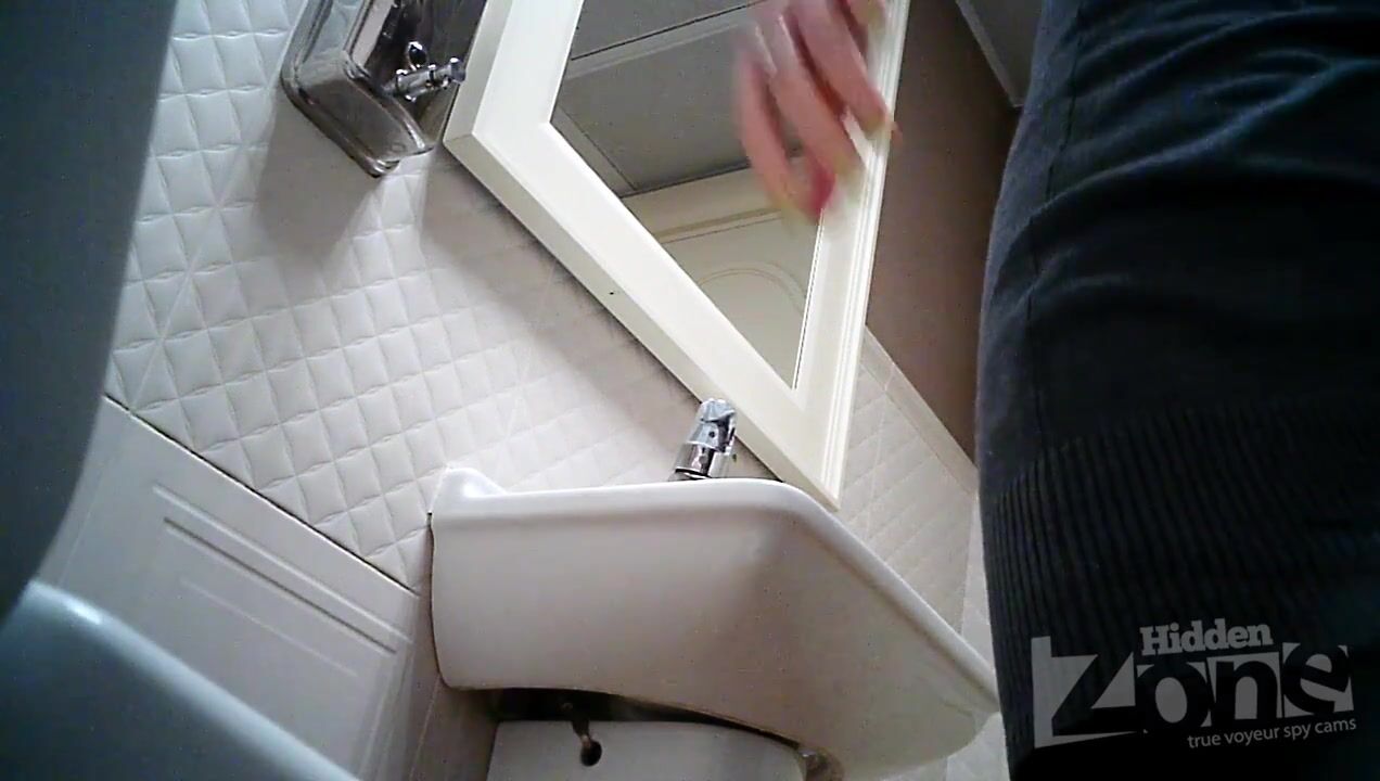 Hidden camera in the toilet cafe. Brunette in black panties pee standing up. View from one camera. Shaved crotch and round ass close-up.