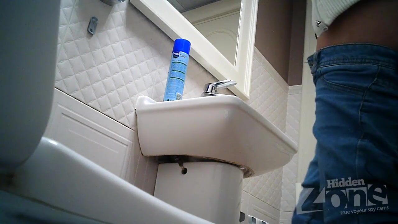 Hidden camera in the toilet cafe. Brunette in black panties pee sitting. View from one camera. Shaved crotch and round ass close-up. Good model for filming with a hidden camera.