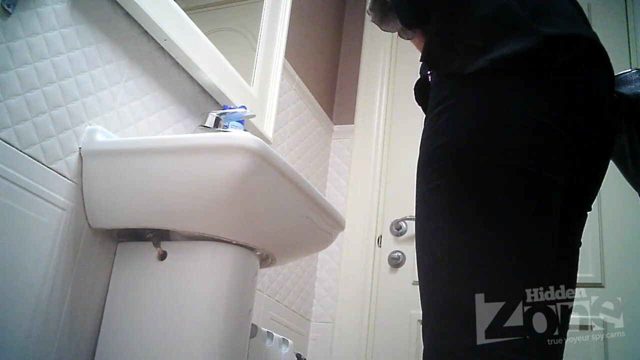 Tanned blonde in blue panties pee standing up. View from one camera. Our hidden camera captured close-ups of her shaved pussy and gorgeous ass with tan lines.