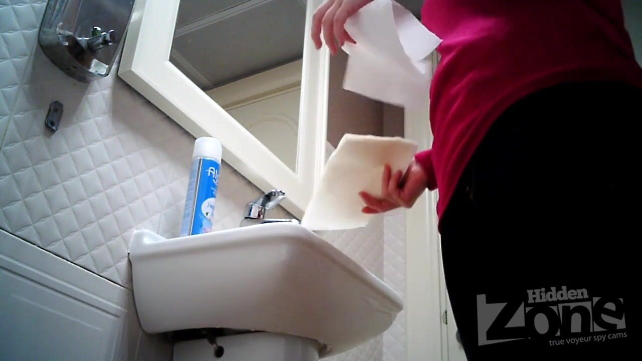 Hidden camera in the toilet cafe. Girl in gray shorts pee standing up. View from one camera. Shaved crotch and anus close up. A good model for filming with a hidden camera.