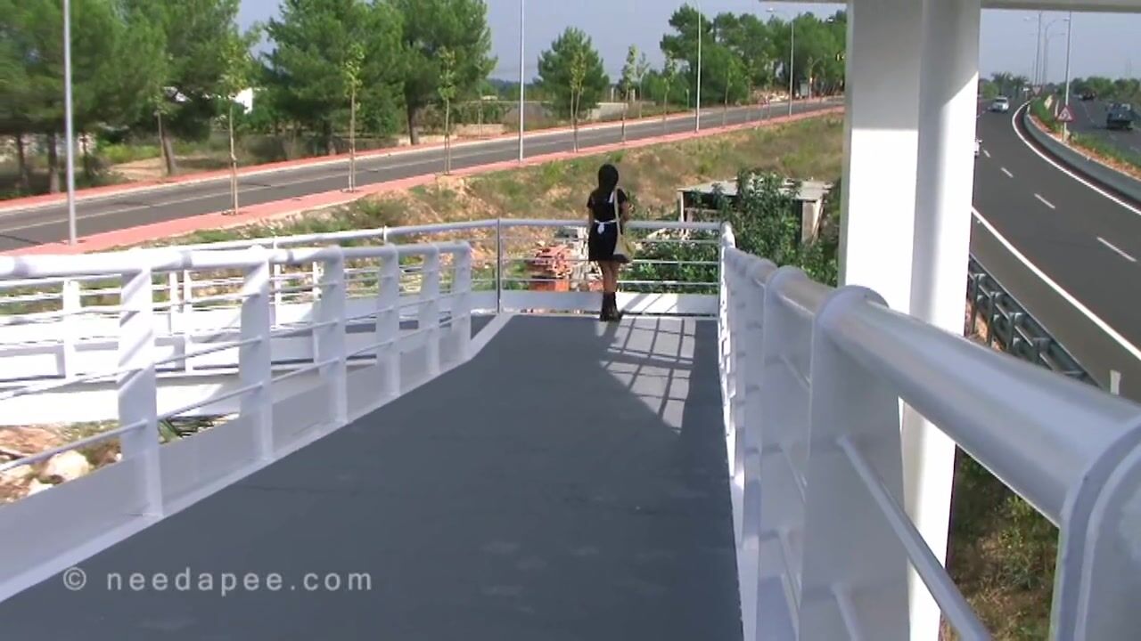 I'm trying to cross a busy road and I'm not having a great deal of luck. The frustration and sound of vehicles whizzing by is making tense and nervous and that's not good when a girl needs to pee. I find a footbridge to cross the road and it looks as if I am quite well sheltered from the passing cars beneath. You know the rest, I pull my panties to the side and let is flow - what relief!