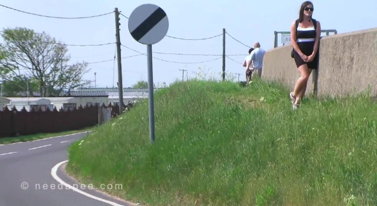 I love the spring months because with the sun shining I can go out in short skirts and dresses - which make sneaky opportunist public pee adventures possible. Like this one for example - on a fine and warm afternoon I'm taking in the views of the sea on a seawall. With passing traffic below I appear to squat and tie my shoe lace, you know me better than that because I'm in fact having a naughty horny piss!