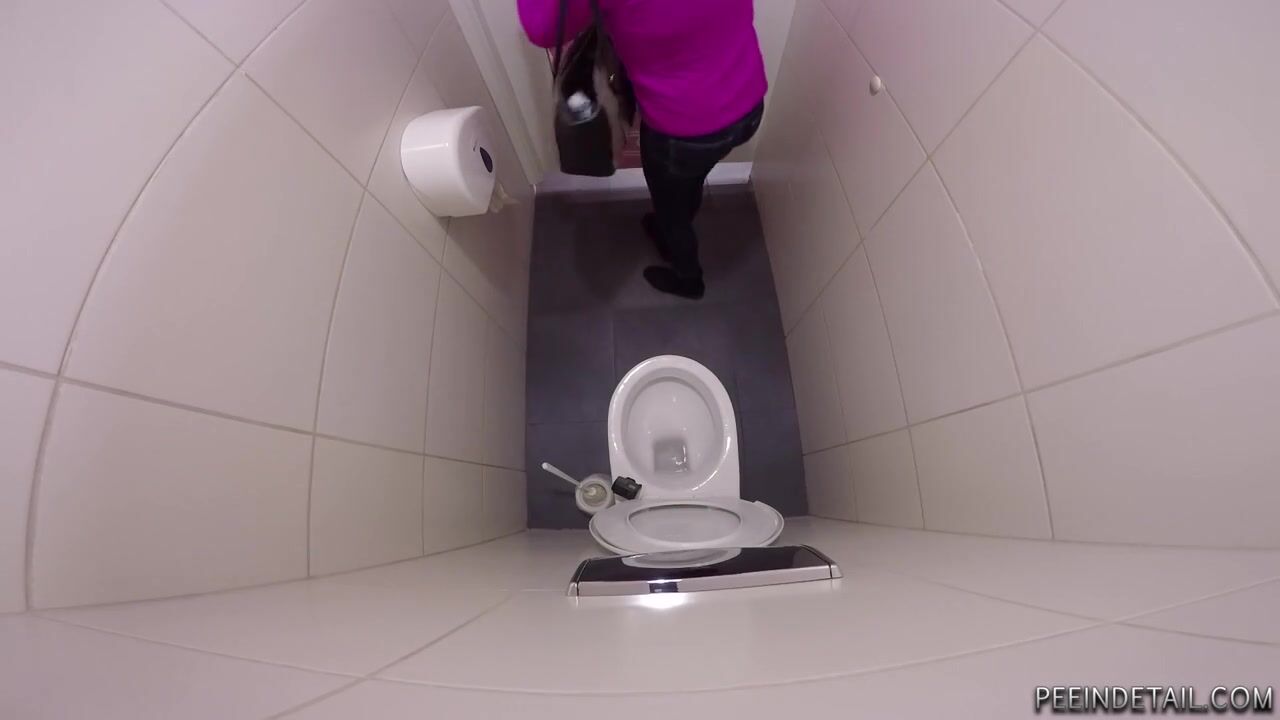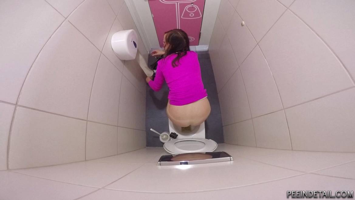 Petra and Laura are still talking about important family and work issues but now it's Petra who really needs to pee. She apologizes to Laura and leaves for the bathroom. Look into the toilet stall and see Petra's butt hovering over the toilet bowl.