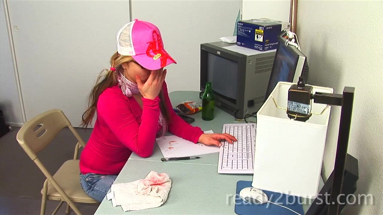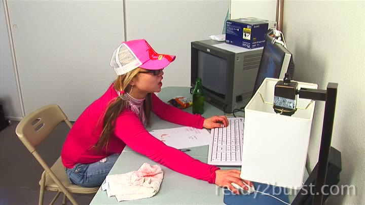 Mia is at work trying to get her tasks done. Her bladder is full but she has deadlines she is trying to meet. She is trying to focus on getting the emails sent but she has to piss so bad. The boss is watching her so taking a restroom break is not an option. Burning sensations in her moist crotch mean trouble. In a hurry she drops her pants in the middle of the office and pisses into the jar. She barely keeps from over flowing it. That little bladder was full! She checks the amount just to be sure before going back to work and getting the task done! When you purchase this video you get both Quicktime and Window Media Media formats in crystal clear High Definition.