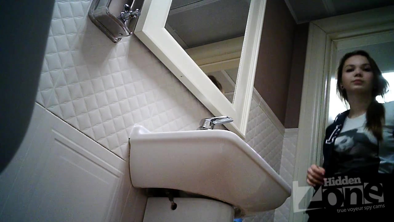 Our hidden camera shot close-up of her shaved pussy and gorgeous round ass. The girl in black panties pissed standing. View from one camera.