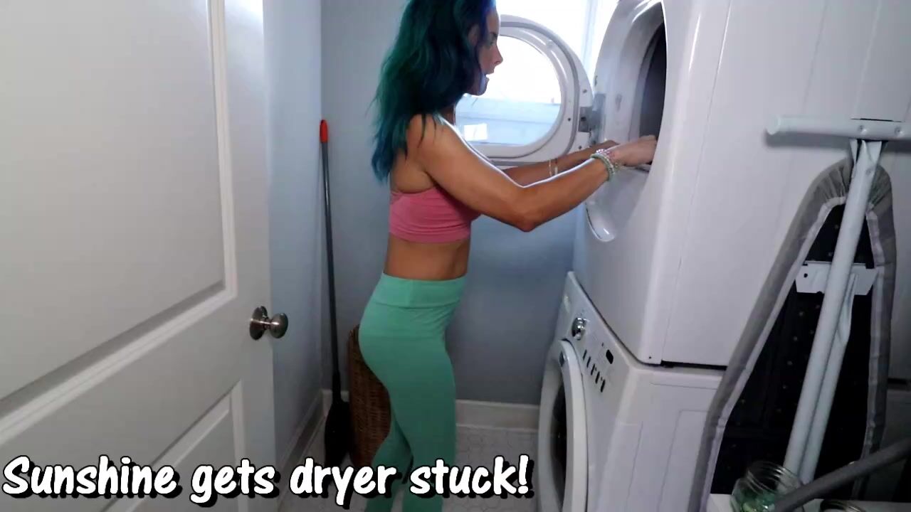 Sexy Sunshine got her heirloom bracelet stuck in the back of the dryer & can't get it loose. Her roommate comes by, accesses the situation & starts tickling her! WTF!? So mean as Sunshine squirms but she can't hang out & HOT PEE is pouring out of her spandex pants & spraying all over as she's shocked!