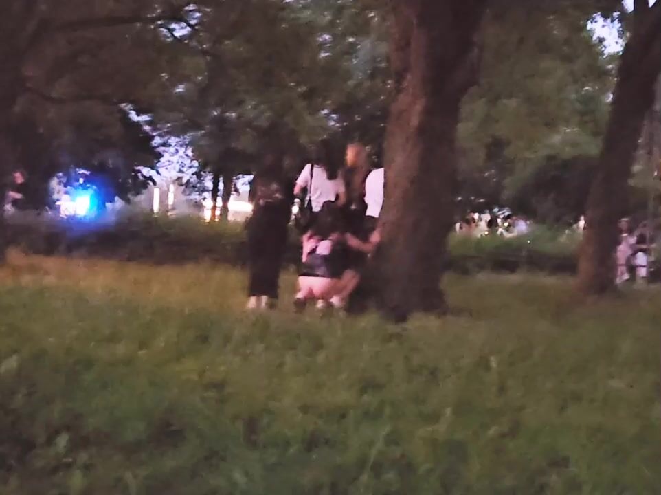 Woman peeing in public behind a tree and guarded by group of friends