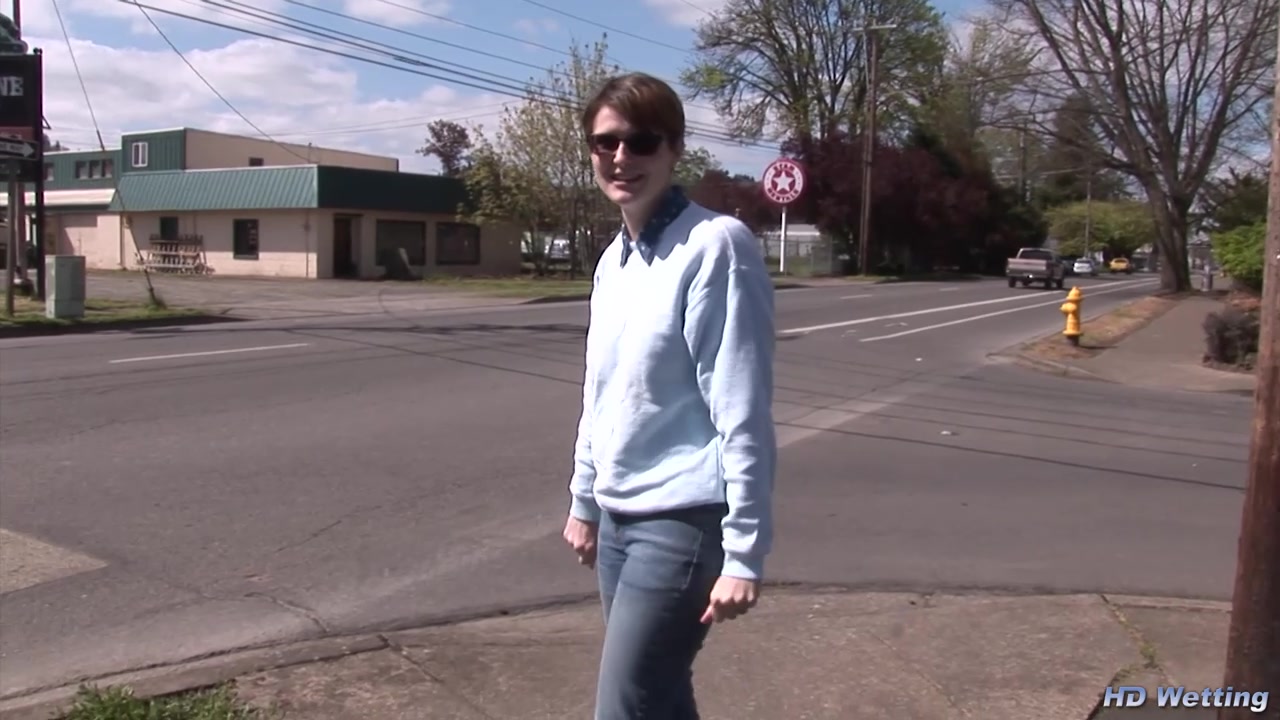 Sosha pees in her jeans in public after Alisha dares her to in this video. Alisha is recording Sosha along a busy city street. Sosha needs to pee, so Alisha dares Sosha do do it in her pants. Not being one to turn down a dare, Sosha agrees. We get to watch as Sosha pees in her jeans in public. She is standing right next to a busy street and cars are passing her as she pees. Once she has finished peeing Alisha has her turn around to show off her wet spot for the camera. Then, embarrassed, she retreats to the relative safety of somewhere private.