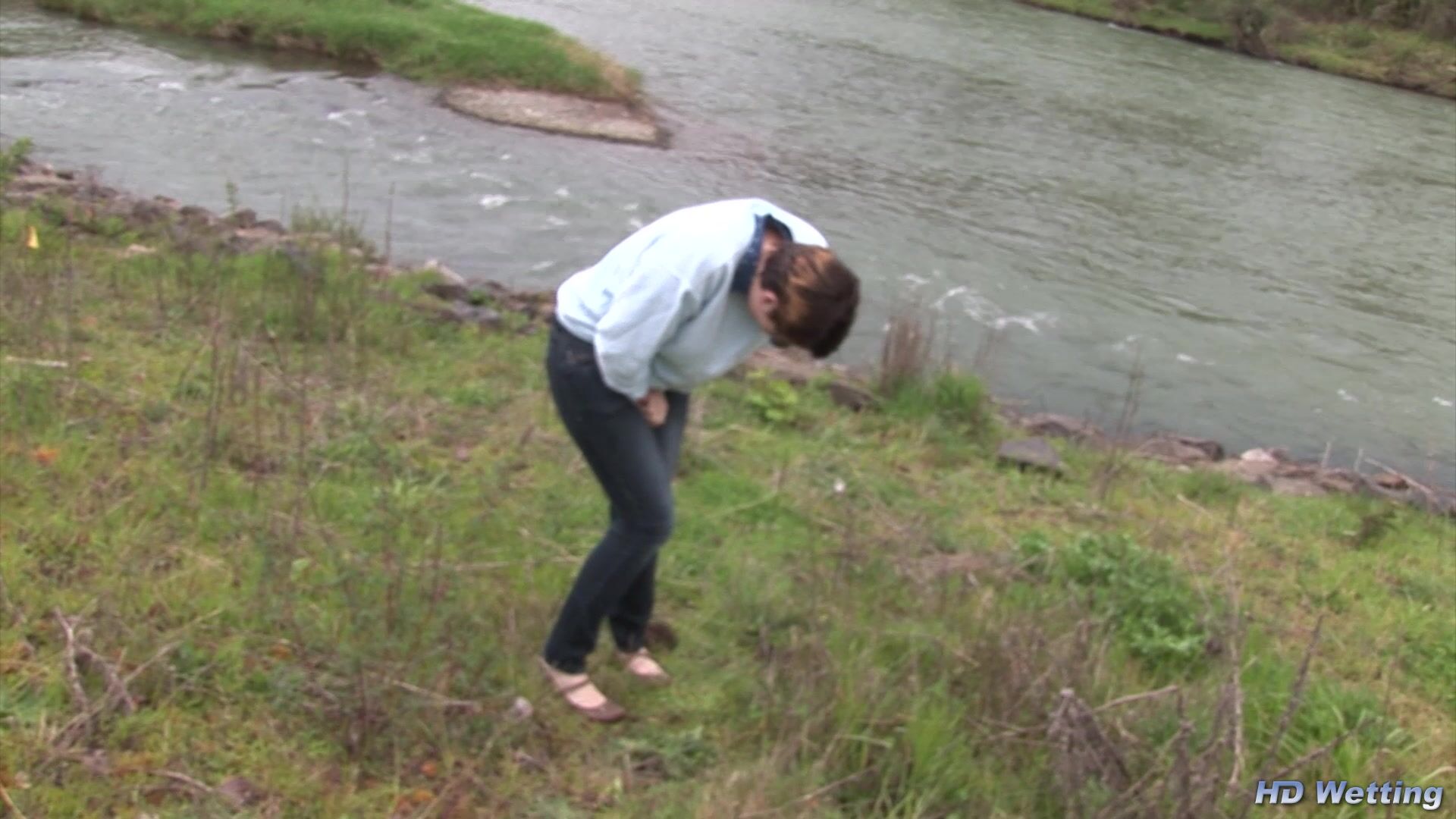Sosha pees in her jeans after being forced to stand next to, and listen, to a river while desperate. In this video Alisha records as Sosha is desperate to pee. There is no bathroom around and Sosha is standing next to a large river. The sound of the flowing water, combined with the sight of the rapids, is too much for Sosha. Unable to hold it she ends up peeing in her pants. Alisha then follows her with the camera, showing her wet jeans from behind.