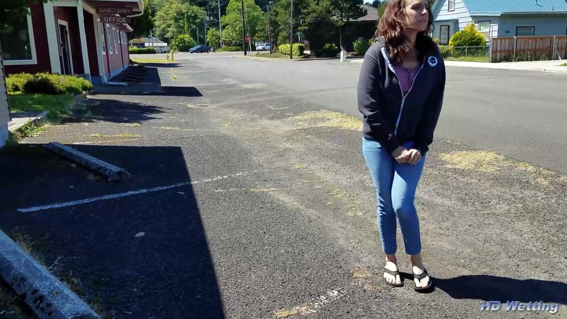 Desperate to pee, and unable to find a bathroom, Alisha ends up wetting her pants in public in this humiliating video. While walking to visit a friend with Gabriella, Alisha finds herself extremely desperate to pee, but there is no place to go. Entertained by this situation, Gabriella starts filming as Alisha struggles to figure out where she might find relief. Unable to locate a discreet place where she can relieve herself, she ends up wetting her pants instead.