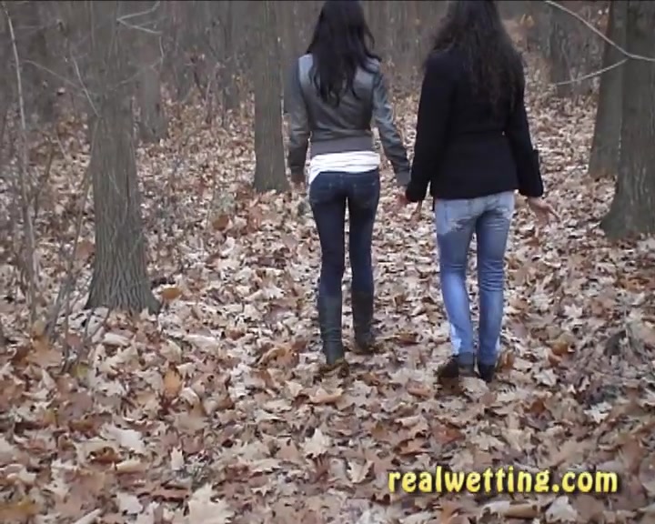 Antonia and Sara pee themselves on purpose while walking through the woods.