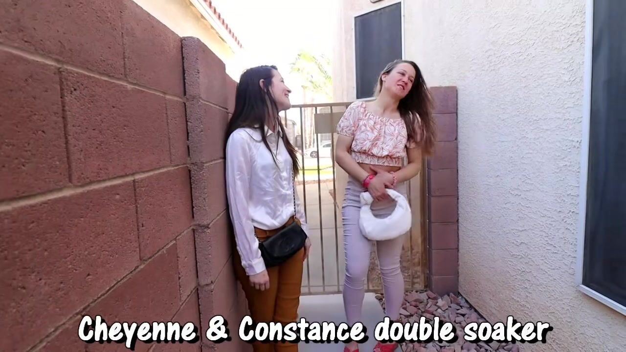 It's a double super soaker this beautiful summer day with 2 wetting veterans, Cheyenne Jewel and Constance. They definitely both have large bladder capacities and see who can hold on the longest after getting locked out. Once one girl loses control it's hard not to totally piss yourself. Fun BTS too.