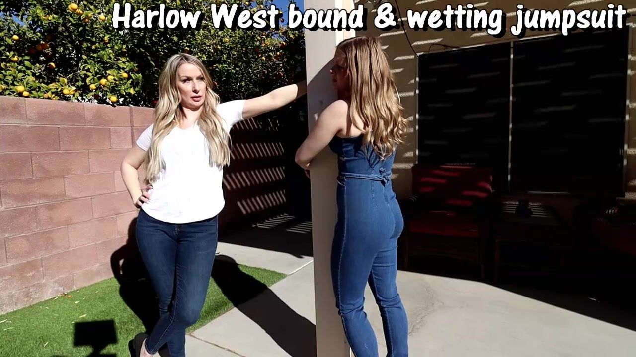 Sydney Paige has tied up Harlow West for her own tickling fetish but Harlow totally needs to pee. She's wearing a tight denim one piece jumpsuit; super sexy. Wow, you can see her bladder bulge! It's a HUGE waterfall of piss through her tight denim, getting all over her feet and sandals! So hot!