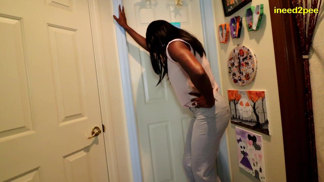 Tall Paris Luv is waiting outside the bathroom at a work function. She's trying to hide her desperation but it's obvious she waited too long & is frantic. Great time to stand in line behind her. She spurts a little & makes a wet spot on her crotch. Soon, she's gushing piss out the front & wetting her white CK panties.